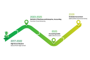 For Will, the pathway offered the opportunity to combine university study with real-world experience inside a council finance team. That experience has now led to a full-time role as a Graduate Accountant at Ballina Shire Council.